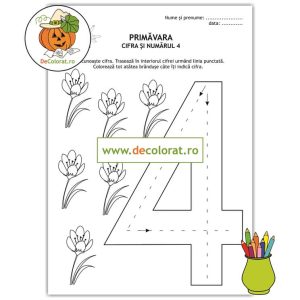 Colorează tot atâtea buline cîte îți indică cifra! – fisă de lucru cu elemente de primăvară – Fisă de activitate cu imagini de primăvara (animale, păsări, insecte și flori) pentru învățarea cifrei și numărului 4.